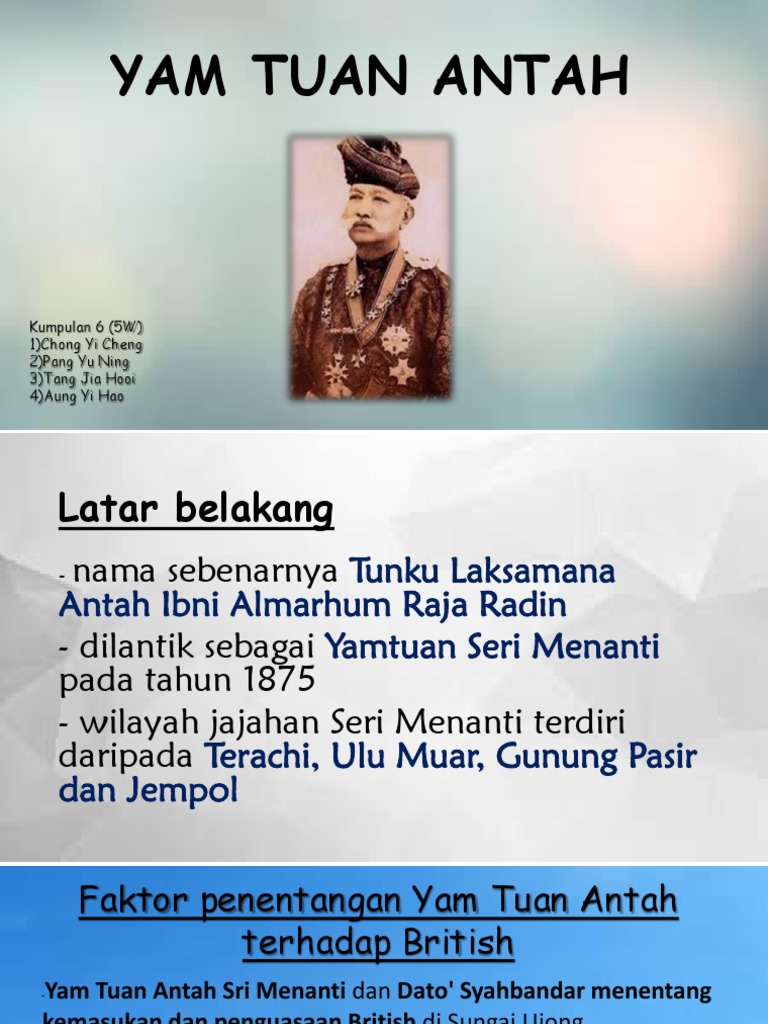 Kumpulan 6 5W 1Chong Yi Cheng 2Pang Yu Ning 3Tang Jia Hooi 4Aung Yi Hao Latar belakang - nama sebenarnya Tunku Laksamana Antah Ibni Almarhum Raja Radin - dilantik sebagai Yamtuan Seri Menanti pada tahun 1875 - wilayah jajahan Seri Menanti terdiri daripada Terachi Ulu Muar Gunung Pasir dan Jempol. The War with Yam Tuan Antah 3 Yam Tuan Radin died in 1861 and was succeeded by his brother Yam Tuan Imam. People Projects Discussions Surnames.